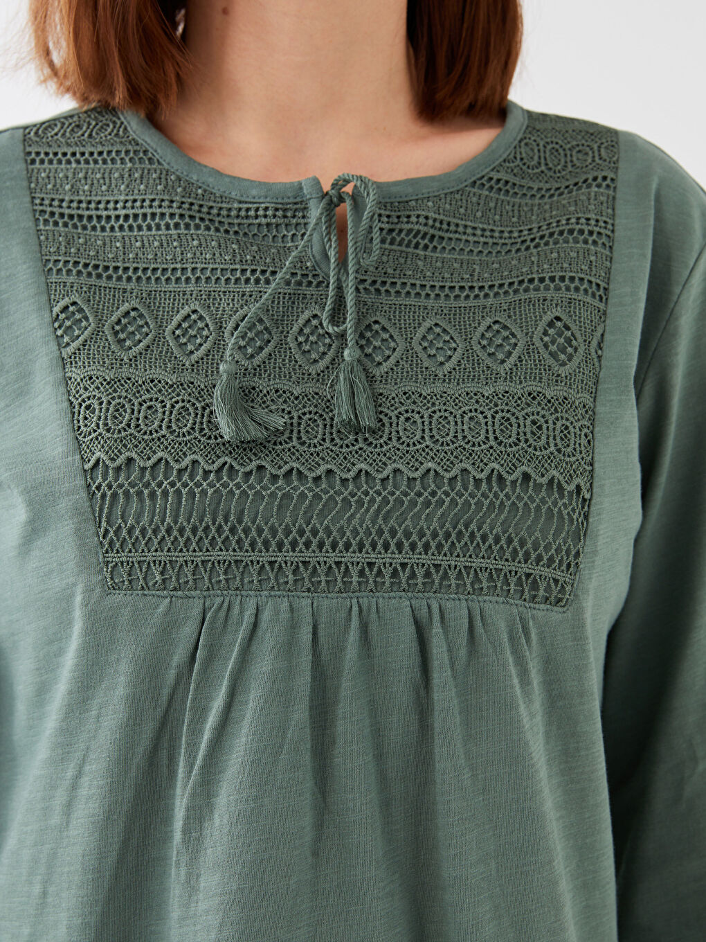 بلوز زنانه آستین بلند گلدوزی شده یقه گره ای ال سی وایکیکی